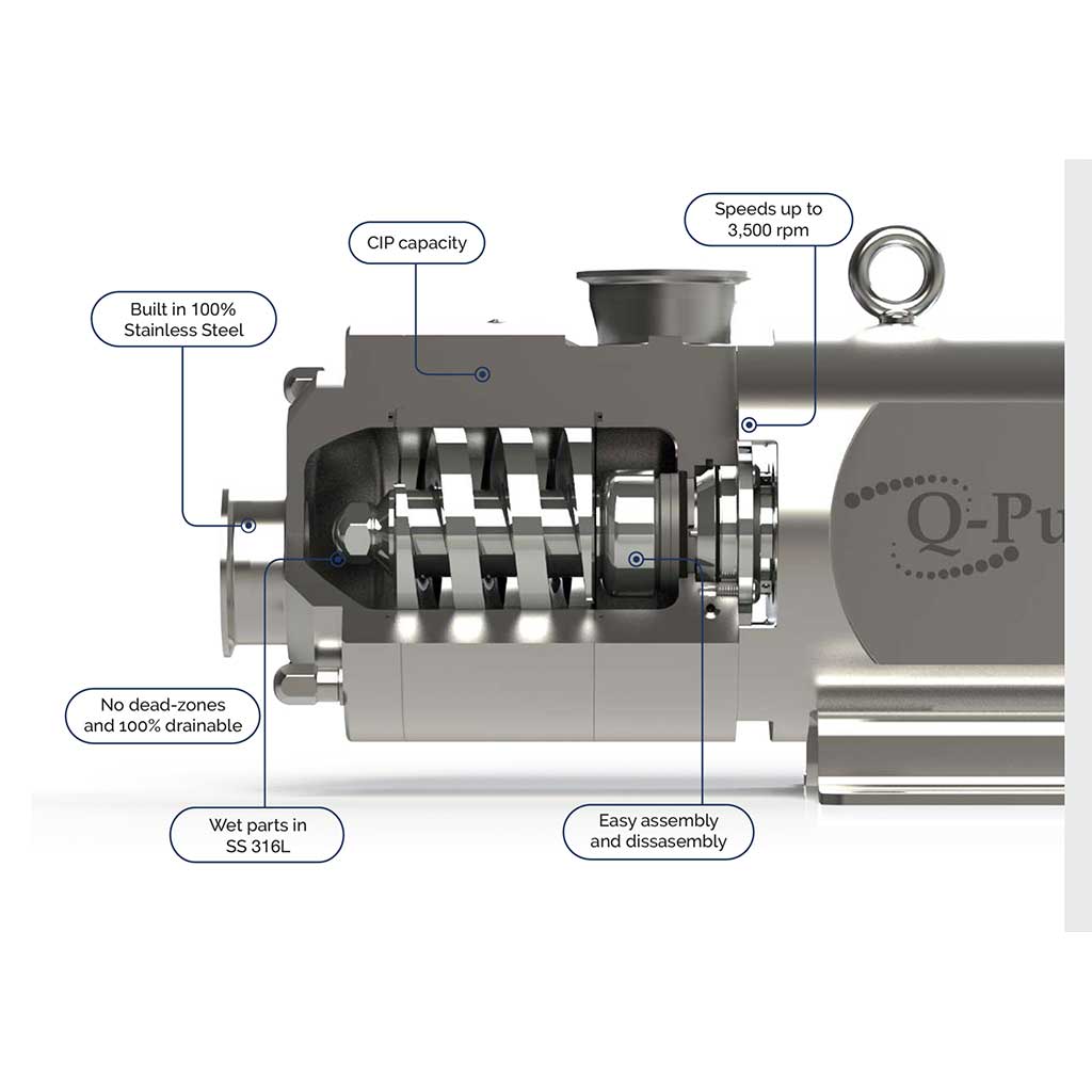 The QTS is a twin screw pump, 100% sanitary use and ideal as a CIP and Process pump, which reduces time and maintenance costs. Also available with rectangular inlet. Ideal for products with high content of air and gas. Certifications: 3-A, FDA and EHEDG