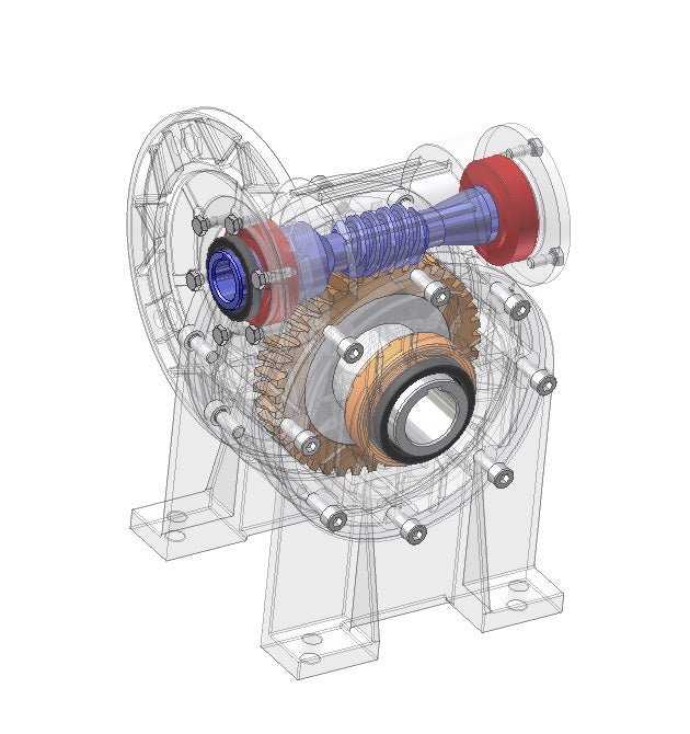 Single reduction worm gear is available in 11 sizes, with input power ratings of 1/8th-75 HP. It comes standard with keyed hollow bore, and ratios from 7.5:1 – 100:1. It uses standard B5 or B14 motors, and has optional output flanges, plug-in output shafts (single or double), and torque limiter.